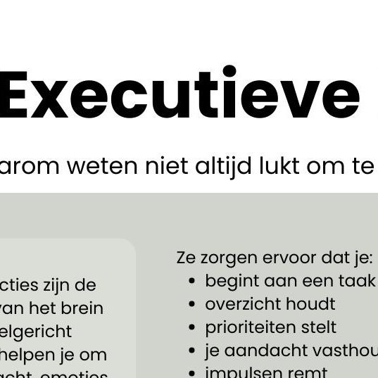 Bij ADHD weten mensen vaak heel goed wat ze zouden moeten doen. De moeilijkheid zit meestal niet in motivatie of intelligentie, maar in de aansturing van gedrag. Executieve functies zijn de regelfuncties van het brein die helpen om te starten, overzicht te houden, prioriteiten te stellen, impulsen te remmen en taken af te ronden.