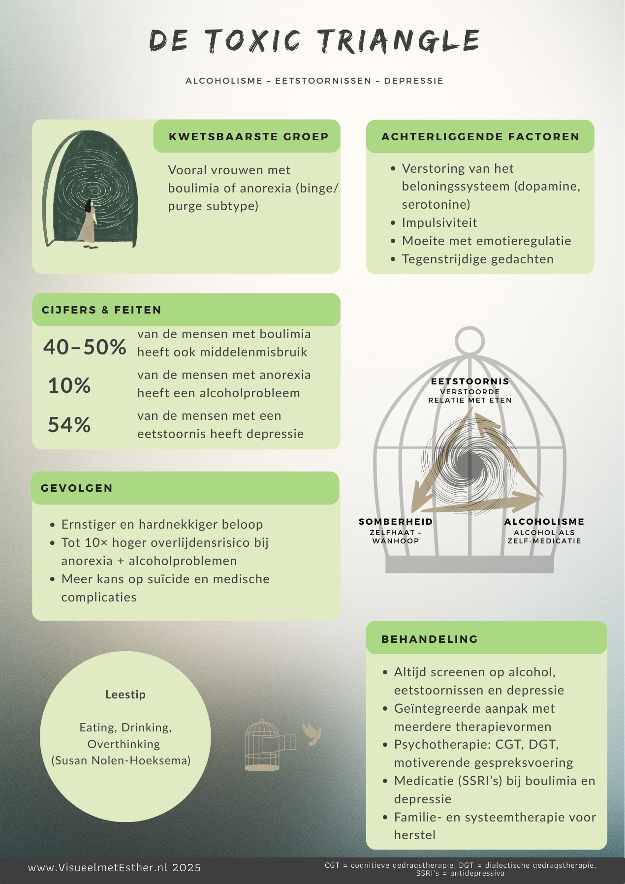 De infographic is gebaseerd op inzichten uit de literatuur over comorbiditeit, waaronder het boek Eating, Drinking, Overthinking van Susan Nolen-Hoeksema, en laat zien waarom het belangrijk is om problemen in samenhang te begrijpen en te benaderen. De informatie is bedoeld ter educatie en bewustwording.