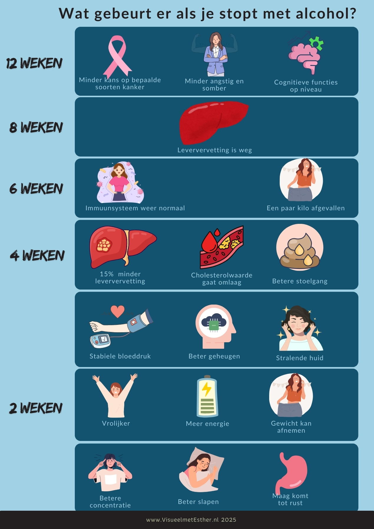 Wat gebeurt er met je lichaam als je stopt met alcohol? In deze visuele kennisplaat zie je welke veranderingen optreden in de eerste weken en maanden nadat je bent gestopt. De infographic laat onder andere zien hoe slaap, energie, stemming, leverfunctie, bloeddruk en cognitieve functies zich geleidelijk herstellen na 2, 4, 6, 8 en 12 weken zonder alcohol.