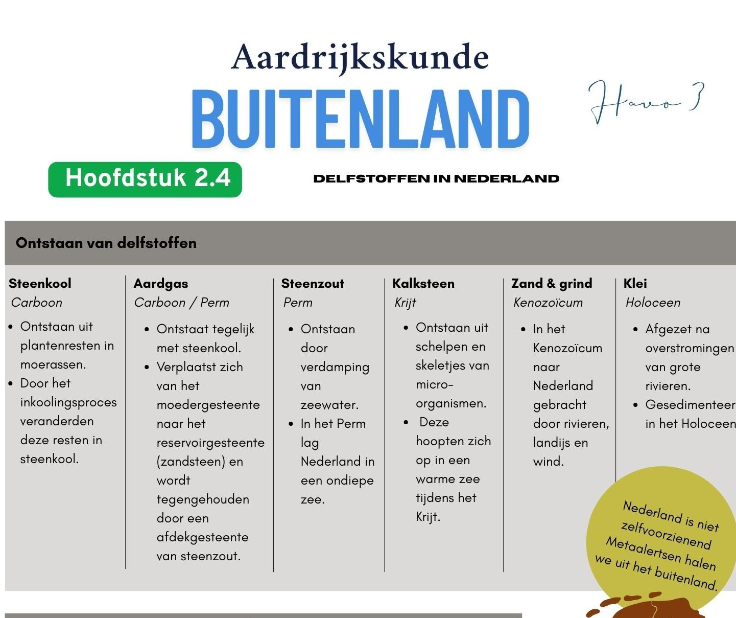 Deze kennisplaat hoort bij BuitenLand aardrijkskunde havo 3 – hoofdstuk 2.4: Delfstoffen in Nederland. De infographic laat zien welke delfstoffen in Nederland voorkomen, hoe ze zijn ontstaan en op welke manieren ze worden gewonnen.